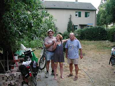 Mittwoch, 25. Juni 2003 Tagesetappe: Baden - Basel Total km: 73km Wetter: schön und heiss So jetzt geht es zur Sache! Nachdem ich meinen Bruder Gerd am Vortage in Kloten vom Flughafen abgeholt hatte und er durch die Zeitumstellung von Kalifornien eine unruhige Nacht bei mir verbrachte, machten wir uns bereit zu unserer Frankreichtour. Die Armbanduhr zeigte auf ein Uhr und die letzten Gegenstände wurden noch schnell in den Fahrradtaschen verstaut und - nach der Verabschiedung unserer Lieben: „Meistens hat, wenn zwei sich scheiden, einer etwas mehr zu leiden“. (Wilhelm Busch) - setzten wir uns wie zwei schwer beladene Panzer träge in Bewegung. Das Gepäck spürten wir schon auf den ersten Kilometern Richtung Brugg, wie es unseren Beschleunigungswillen einschränkte („Rom wurde auch nicht in einem Tag erbaut“ kreiste in unseren Köpfen herum). Um nicht wie vor zwei Jahren im Wald zum Bözberg umher zu irren, wählten wir den mir gut bekannten Wanderweg. Am Anfang des steilen Waldweges wurden die Stahlrosse einzeln, im wahrsten Sinne des Wortes „mit vereinten Kräften nach oben gestossen und gezogen“. Nachdem die Räder oben angekommen waren, wurden - auch durch die grosse Hitze - die ersten Schweisstropfen auf unserer Stirn sichtbar. Ein kräftiger Schluck aus der Wasserflasche tat da schon gut und weiter ging es auf ebenem Grund ca. 2 Kilometer weiter. Jetzt hiess es „wer sein Fahrrad liebt, der schiebt“! Und schon ging der Fussmarsch in Richtung Bözberg los. Oben angekommen, war bereits die erste unserer vier 1 ½ Literflaschen leer. Mit 55 km/h sausten wir den Bözberg hinunter in Richtung Frick. Leider war das Vergnügen nicht all zu lange, denn nach kurzer Fahrt verflachte sich die Strasse und wir mussten wieder trampeln. Ein wunderschöner Veloweg entschädigte aber die Enttäuschung der kurzen Abfahrt und wir kamen abseits des Verkehrs recht gut voran. Die Gedanken waren immer noch beim Gepäck; „Haben wir wirklich alles eingepackt oder liegt noch irgend etwas im Keller bei mir zu Hause herum und wartet auf seinen Besitzer“? Mit dem Spruch „Mindestens 98 Prozent der Dinge, um die wir uns Sorgen machen, treffen niemals ein“, wurden jedoch diese Gedanken abgehakt. |