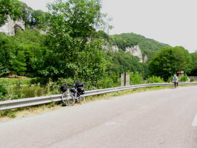 Teilweise schiebend und fahrend erreichten wir gegen Abend nach einer angenehmen Abfahrt das in einem hübschen Tal eingebettete Städtchen Hérimoncourt und betrachteten es, bevor wir die letzten Serpentinen hinunter kurvten, aus luftiger Höhe von einem Rastplatz aus. |