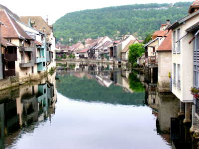 „Jetzt sollte es doch wirklich mal wieder runter gehen nach der schweisstreibenden Wanderung himmelwärts“. Nach einem kräftigen Schluck Wasser aus der Flasche, welches wie lauwarmer Tee schmeckte (ca. 34°C), ging es doch gemütlich mit 42 km/Std. talwärts. Ohne grosse Bremsversuche kamen wir gute 10 km voran und erreichten kurze Zeit später auf der D67 den Ort Ornans. Das Flüsschen Loue und die alten, zum Teil auf Pfählen gebauten Häuser an seinem Ufer gaben dem Städtchen ein malerischen, reizvollen Ausdruck. Auf der D492, die wir beinahe auf Anhieb fanden, ging es durch aufgelockerte Hügellandschaft weiter in das 14 km entfernte Dorf Bolandoz. Eine halbe Stunde in der Hitze weiter radelnd, erreichten wir das winzige Dorf Nans-s-Ste. Anne, auf dem ein Schild zu dem Naturdenkmal der Lison- Quelle zeigte. |