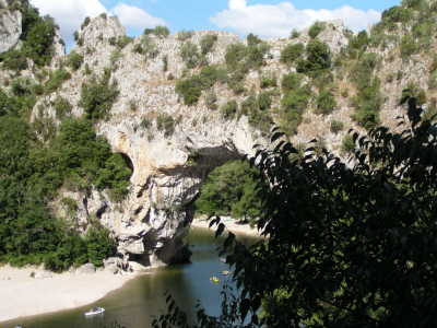 Am Morgen war es endgültig mit unserem Früchtebrot zu Ende. Wir mussten das erste Mal zu einem Baguette greifen. Nach einer etwas unruhigen Nacht zogen wir ins Tal der Ardèche und konnten nach einer Stunde das Städchen Vallon de Point Arce erreichen. Wir deckten uns mit 6 Litern Wasser ein und kauften noch Brot zum Mittag. Die Weiterfahrt war nur ein einziges grosses Staunen über die Landschaftsbilder, die an uns vorbeizogen. Man sollte Schriftsteller sein, um das ganze einigermassen in Worte zu fassen. Wir mussten immer wieder anhalten, um die herrliche Kalksteinlandschaft auf uns einwirken lassen. Jetzt zeigten sich die Vorteile des Fahrrades gegenüber dem Auto. Wo man wollte konnte man kurz einen Stop einlegen und die herrliche Aussicht geniessen. Unter anderem natürlich auch den berühmten Point-d`Arc. Toll wie die Wasserkräfte sich in jahrelanger Arbeit durch den Felsen frassen. |