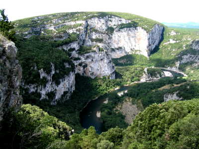 Nahmen wie: Belvédère du Serre de Tourre, Belvédère de Grand, Belvédère` d`Audridge und Belvédère de Gournier sind nur die bekanntesten. Die Ardèche grub sich in Jahrtausenden bis zu 300m Tiefe in das Bergmassiv und hinterliess schroffe Felsformationen. Des öfteren mussten wir gar nicht erst absteigen, da wir vielerorts sowieso am Schieben waren. Am Ende der Schlucht kam das verträumte Städtchen St. Martin de Ardèche in Sicht. Nach dem Städtchen hätten wir eigentlich rechts abbiegen sollen. Wir merkten unseren Fehler jedoch erst 6 km später, als wir plötzlich auf einer Nationalstrasse standen. Der Spruch: “Je planmässiger ein Mensch vorgeht, desto wirksamer vermag ihn der Zufall zu treffen“, liess uns umdrehen, um wieder auf den richtigen Weg zu kommen. |
