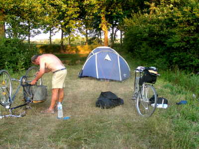 Um etwa zwanzig Sekunden waren wir schneller bei dem einzigen beschatteten Tisch als andere Urlauber mit Wohnwagen. Sie mussten leider mit einer Bank im Halbschatten vorlieb nehmen und wir hofften für sie, dass ihr Auto wenigstens mit einer Klimaanlage ausgerüstet sei. Zwiebeln und Kartoffeln wurden geschält und die Brutzlerei ging los. Zum Schluss wurde der gut gewürzte Seelachs der Grösse wegen in drei Etappen in die Pfanne gehauen. Kurz darauf war das Mittagsmenü auf unseren Tellern serviert. Um vier Uhr schwangen wir uns gut gesättigt wieder auf die Fahrräder. Nach kurzer Fahrt hatte sich bei Gerd wieder mal ein Dorn durch das Vorderrad gebohrt. Der Schlauch wurde daraufhin mit vereinten Kräften repariert und weiter ging die Fahrt dem Kanal entlang. An einem schönen Rastplatz in der Nähe der Autobahn assen wir noch schnell eine Kleinigkeit und füllten die Wasserflaschen. Auf einem megaschönen, asphaltierten Weg ging es unter den Baumalleen weiter in Richtung Toulouse, wobei wir noch einige Fischotter im glitzernden Wasser der untergehenden Sonne beim Fischen beobachten konnten. Einige Kilometer weiter fanden wir ein bisschen von der Autobahn abgelegen einen geeigneten Platz zum Zelten. Schnell war unser nächtliches Heim aufgestellt und anschliessend machten wir uns an den dreckigen Rädern zu schaffen, um sie für die kommenden Tage wieder in Ordnung zu haben. Unter dem Motto „Gut geölt ist halb gefahren“ wurden alle Lager geschmiert. Einige Tage zuvor hatte ich schon kleine Probleme mit meinem linken Pedal, das Knackgeräusche von sich gab und zeitweise blockierte. |