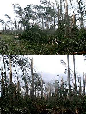 Ich hatte keine Lust mehr weiter zu fahren und durch meine Überredungskunst und feste Entschlossenheit, hier zu bleiben, willigte er ein, was sich später als grosses Glück heraus stellte. In einer kleinen Mulde, auf der einen Seite 10m erhöht die Strasse und auf der anderen Seite erhöht eine Pferdekoppel, war der Gerd gerade noch fit genug, das Zelt aufzustellen (tat Gerd alleine, während ich schrieb). Dumpfes Rollen des Donners kündigte ein Gewitter an. Er fragte mich noch, ob er die Abspannseile montieren soll. Ich verneinte das, in der Annahme, dass es sicher nicht so stark winden würde. Blitze zuckten aus allen Richtungen, als wir uns in das Zelt begaben, und Gerd meinte noch lakonisch, dass es sich wohl um ein trockenes Gewitter handeln würde. Um halb zwölf Uhr, Gerd schlief schon fest und ich döste vor mich hin, kam starker Wind mit heftigem Regen auf. Jetzt ging alles Schlag auf Schlag. Das Zeltgestänge bog sich beängstigend zu Boden und der starke Wind wurde zu Orkanböen mit starkem, herunter prasselndem Regen. Ich sprang auf, um die Zeltstangen wieder in ihre ursprüngliche Richtung zu bringen und einen Stangensalat zu vermeiden. Aus allen Himmelsrichtungen blitzte und donnerte es. Unwetter ist nur der Vorname zu diesem Getöse. Schlaftrunken meinte der Gerd, nachdem ich ihn mit Mühe geweckt hatte „was ist denn los, kannst du mich nicht schlafen lassen?“. Eine halbe Stunde mussten wir die sich immer heftiger durchbiegenden Zeltstangen halten, um keinen Bruch zu erleiden. Wie das Unwetter gekommen war, war es auch plötzlich wieder verschwunden. Erleichtert sanken wir um ein Uhr geschafft auf unsere Schlafsäcke und schliefen auch sofort ein. |
