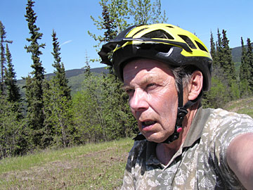 Günter hatte recht! Am frühen Morgen ging es hinter dem Zeltplatz aufwärts, und wie! Teilweise schiebend erklomm ich den Berg. Schweiss rann aus allen Poren und mein Trinkwasser schien zur Neige zu gehen auf der staubigen, zum Teil durch Schotterpiste unterbrochenen Strasse. Bei 1800 Höhenmetern dachte ich, der Gipfel wäre erreicht. Leicht abwärts durchfuhr ich eine Hochebene, um anschliessend nocheinmal 300m in die Höhe zu klettern. Die bezaubernde Landschaft liess jedoch alle Anstrengungen vergessen. Ich wurde tatsächlich in die Zeit von Jack London versetzt. In der Nähe des Flusses wurde in einer Mine noch nach Gold gesucht. Sollte ich es nicht doch einmal versuchen nach Goldklumpen im Bachbett zu suchen?
