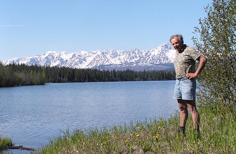 Nun muss ich doch einmal berichten, wie ich bei meiner Tour zu dem wichtigen Trinkwasser kam. Eigentlich sind ja Alaska und auch Kanada regenreiche Länder mit vielen Flüssen und Seen. Leider versickert das Trinkwasser sehr schnell in dem zum Teil lockeren Gestein. In Bächen, die man immer wieder von der Strasse aus sieht, muss man grössere Vorsicht walten lassen, denn wenn diese Bäche aus höher gelegenen Seen stammen ist mit einer Verschmutzung durch Biber zu rechnen, was zu einem 10 tägigen Totalausfall durch Biberfieber führen kann. Ich versuchte kleine, überschaubare Rinnsale anzuzapfen. War ich beim Wasser fassen einmal unsicher kam meine Filterpumpe zum Einsatz. Dadurch hatte ich nie Probleme. In bewohnten Gebieten wurden die Trinkflaschen an Tankstellen oder Restaurants aufgefüllt. Mitten in der Wildnis tauchte dann ein Hotel im Walliserstil errichtet auf. Ich bog zum Hotel ab und liess mich von meinem heftigen Durst geplagt zu einem Coca Cola überreden. Der Inhaber, ein ausgewanderter Zermatter bediente mich und erzählte voller Freude, dass im Winter Touristen hier zum Heliskifahren kommen. Ich dachte bei mir: " Noch so ein technischer Unsinn des 20. Jahrhunderts in der unberührten, faszinierenden Landschaft." Moose sind in Nordamerika keine kleinen grünen Pflanzen, sondern wie in Nordeuropa Elche. Ich durchfuhr gerade eine Sumpflandschaft, als so ein Riesentier, die zwischen 600 und 800kg wiegen können, wenige Meter vor mir die Strasse kreuzte. Erst Tage später erfuhr ich, dass sie im Herbst gefährlicher sein können als Bären. Also hatte ich keine Angst im Moment und fuhr ohne beschleunigten Puls weiter. |
