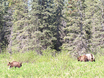 Zuerst traute ich meinen Augen nicht. Aber es war Wirklichkeit. Ich kam um eine langgezogene Kurve und da standen sie. Vier Grizzlybären grasten neben der Strasse. Also gab es auch hier diese Monster. Ich stoppte und eine alte Bärenmama, durch die Bremsgeräusche etwas verwirrt, stellte sich auf die Hinterbeine und schnupperte in die Luft. Wauuu... war die gross! Schon etwas mutiger wurde die Kamera gezückt, um das Fotoalbum zu füllen. In grossem Bogen umfuhr ich anschliessend die Monster, die sich jedoch von ihrer Fresssucht nicht abhalten liessen. Kurze Zeit später stoppte ein mir entgegen kommender Lastwagen und warnte mich vor Schwarzbären, die zwei bis drei Meilen vor mir sein sollten. Hört das denn nicht mehr auf mit den Biestern?